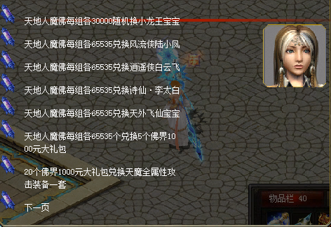 领取 魔魂+18属性+2555装备。送星雅2只、白逍遥2只。存折10000张,积分30亿,真气3000w,