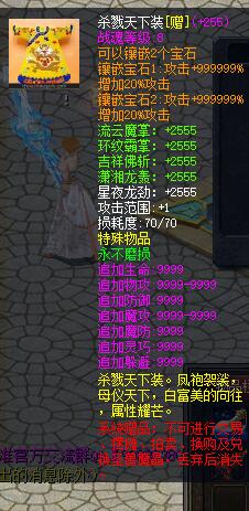 魔魂+255属性+2555装备。属性武器圣杯宝箱一个、顶级会员定制宝宝7只、东海小龙王宝宝7只、、存折60000张,开7宠、天皇、地魔、人帝、魔尊、佛界福利卡3000张.