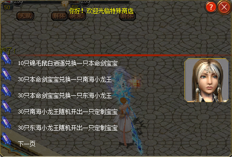 东海小龙王宝宝2只、送本命剑5只、白逍遥5只。存折50000张,开4宠